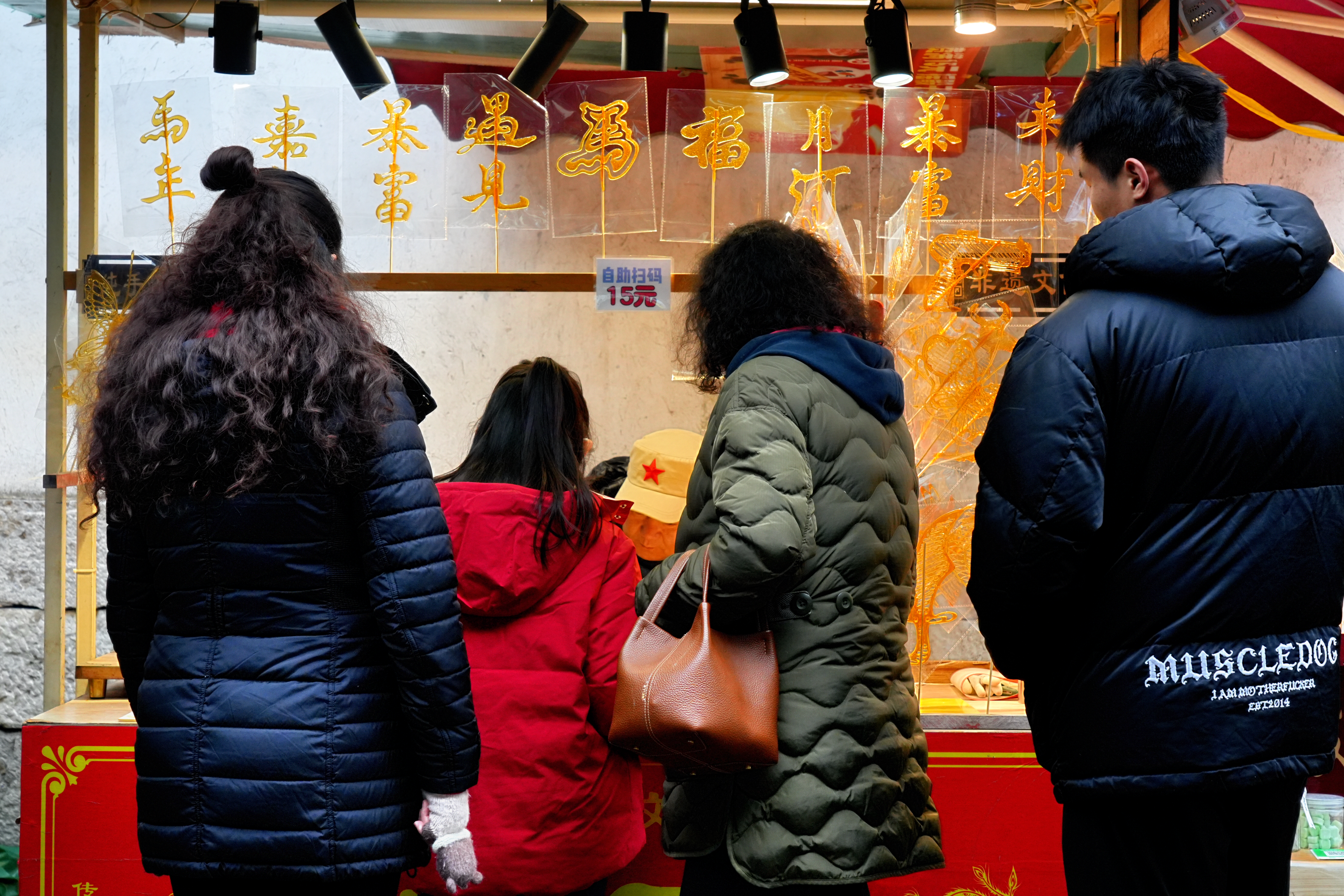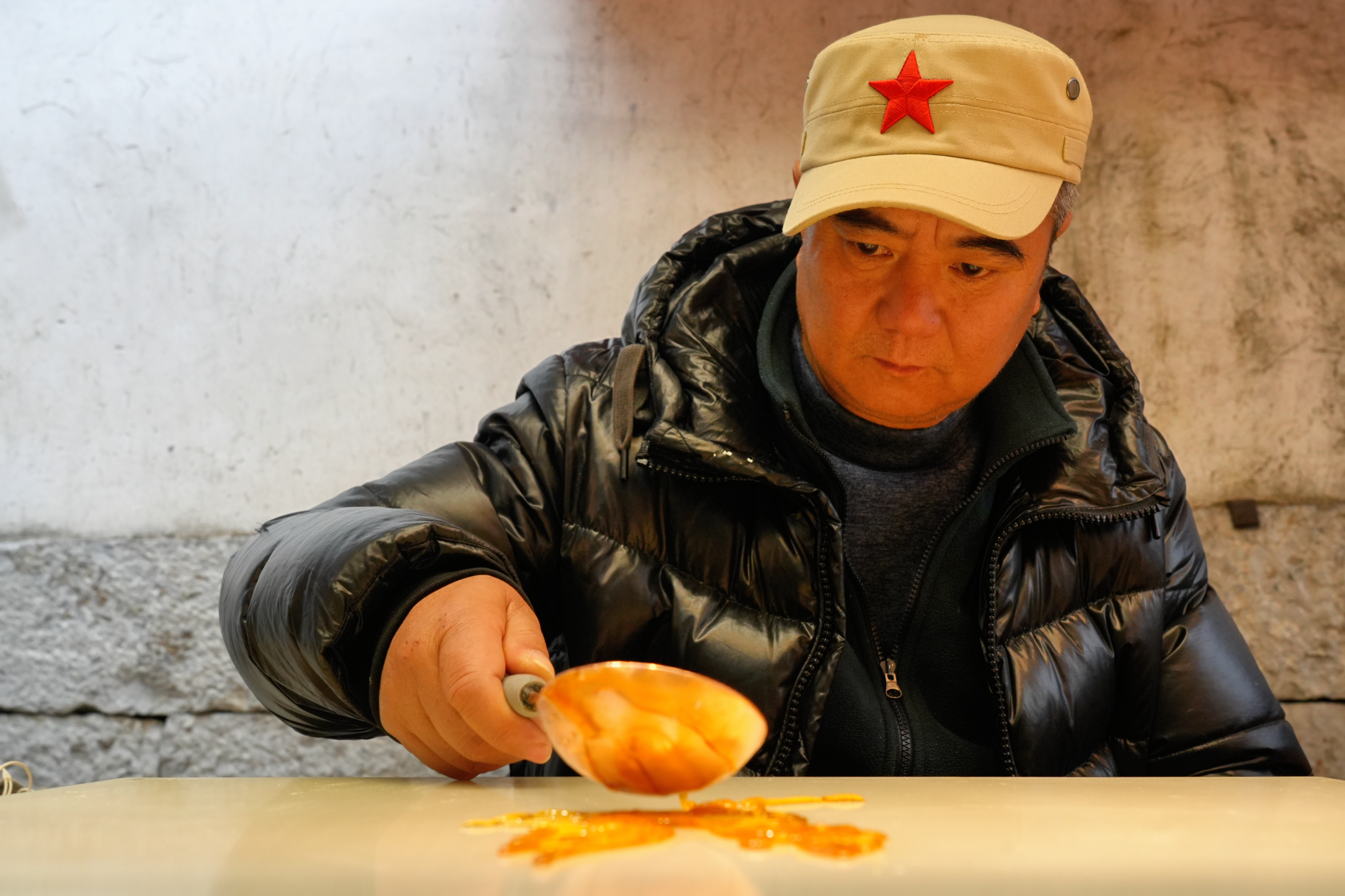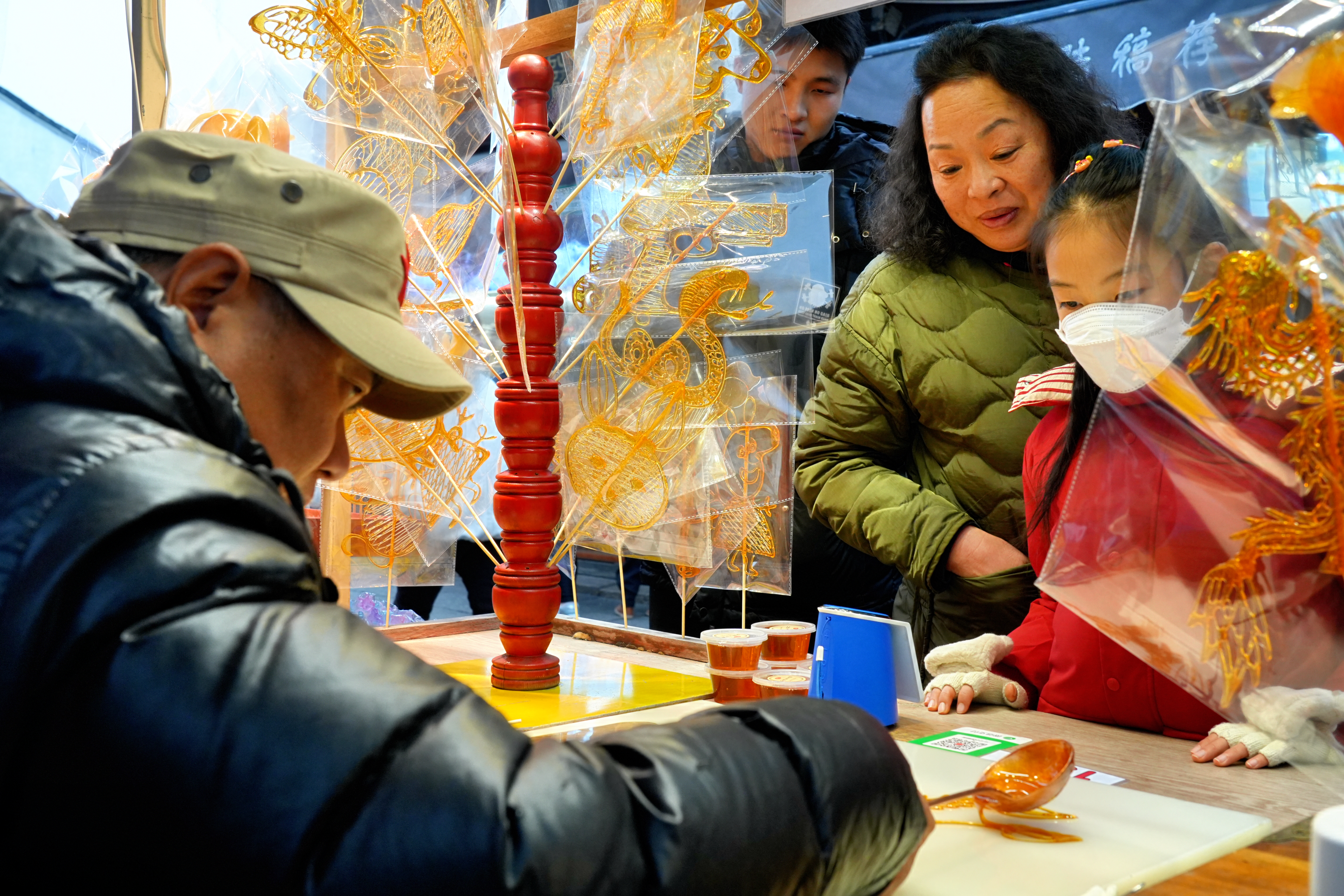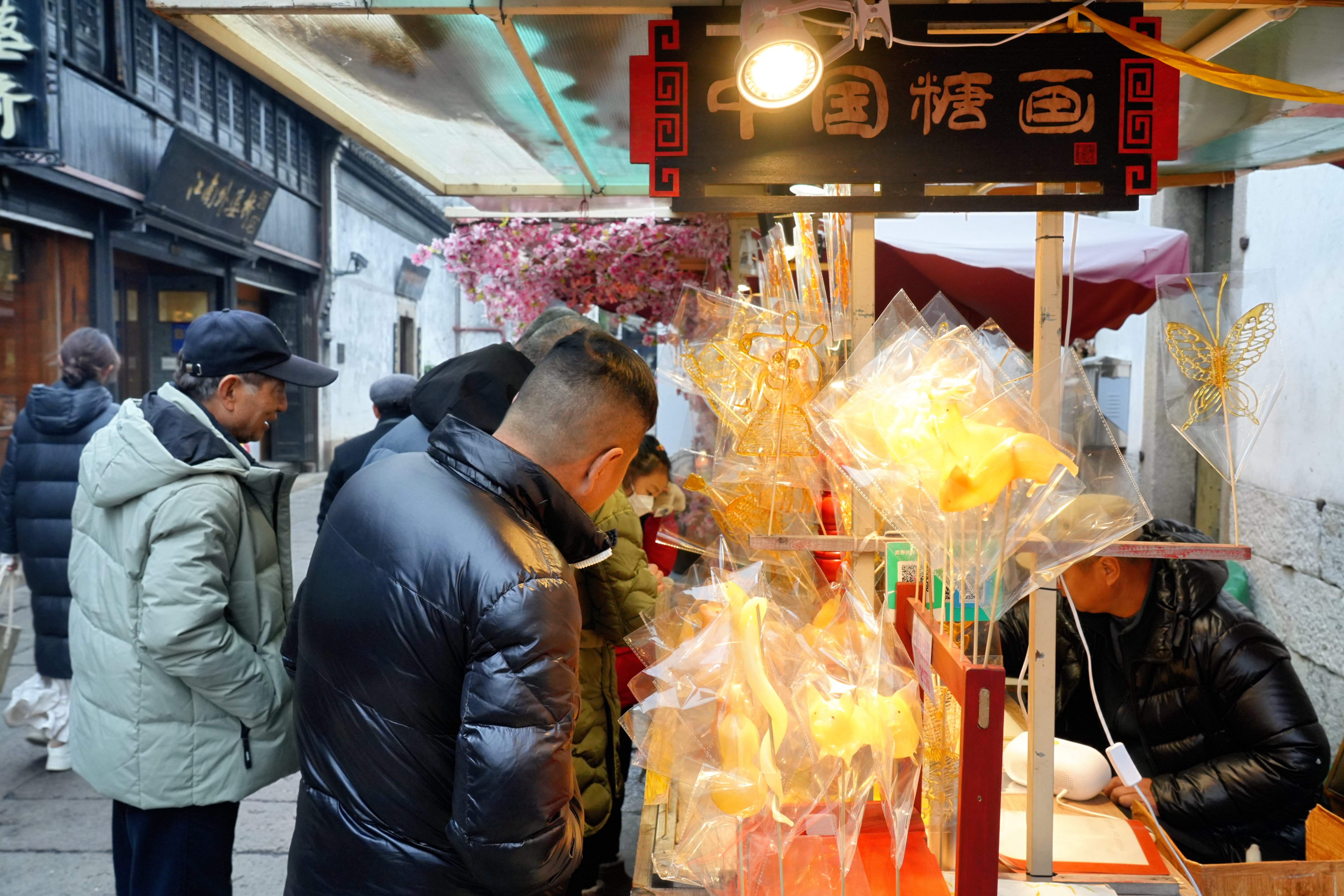 今天(1月4日),在嘉兴市区月河历史街区内,糖画摊位前人头攒动,制糖人的精湛手艺吸引了不少游客和市民驻足观看。