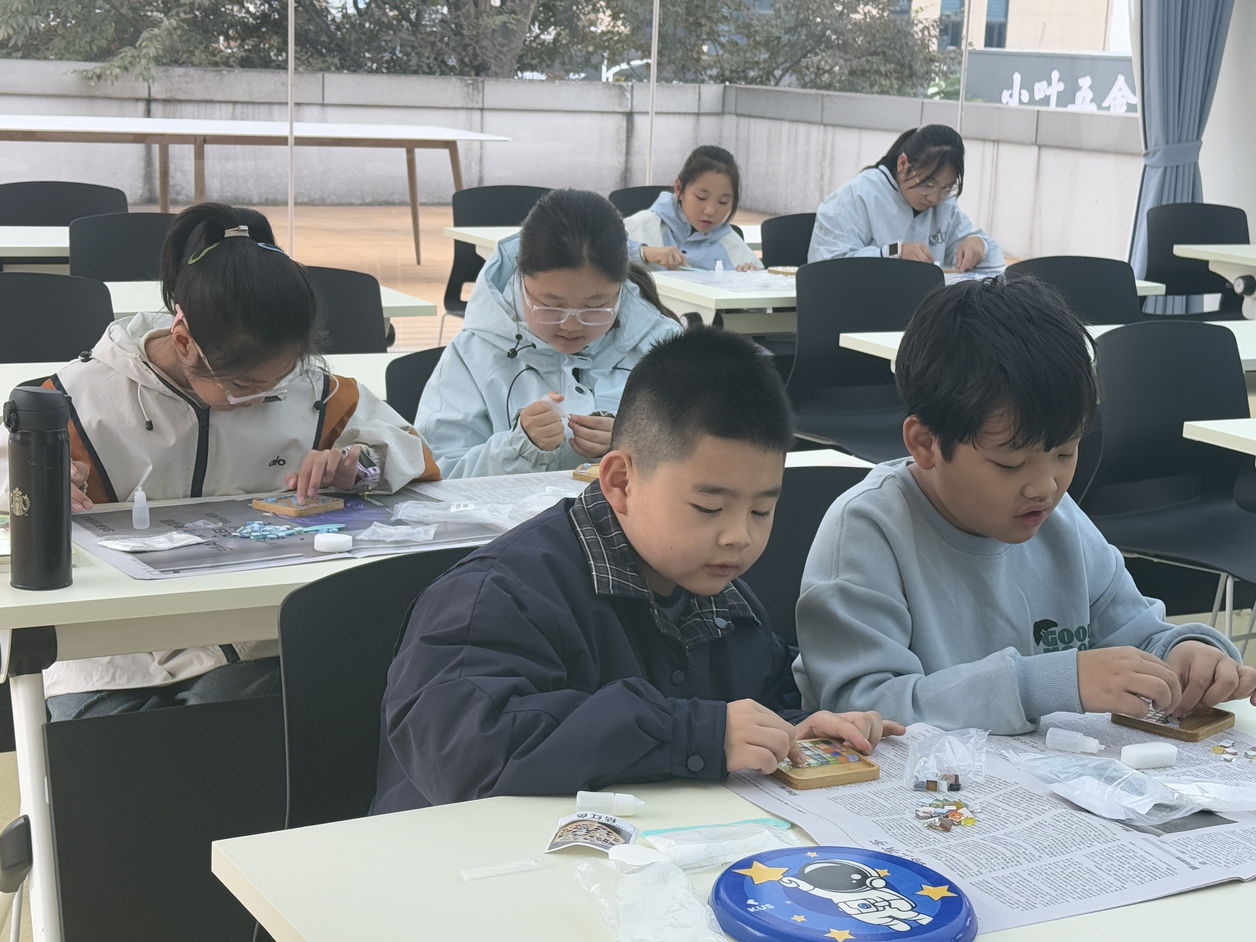 在学习之余,社区还为孩子们准备了一场别开生面的创意放松活动——手工杯垫DIY。活动现场,五彩斑斓的马赛克碎片、晶莹的玻璃石、各色颜料和模具一应俱全。在专业手工老师的指导下,孩子们充分发挥天马行空的想象力,将一颗颗小小的材料精心拼贴、绘制,创作出属于自己独一无二的创意杯垫。从构思、配色到动手制作,整个过程充满了欢声笑语。孩子们互相展示自己的作品,脸上洋溢着自豪与喜悦。一个小小的杯垫,不仅锻炼了他们的动手能力、专注力和创造力,更成为了这个秋假最特别的纪念品。