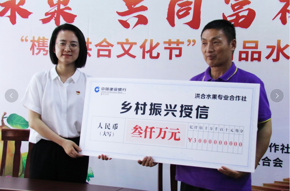 另外,为了更好的为农产品种植、养殖户提供资金支持,中国建设银行股份有限公司嘉兴分行还在精品水果推介会上举行了乡村振兴金融助农授信,金融助力洪合精品水果产业发展。