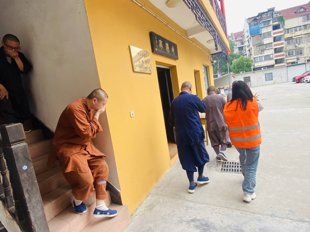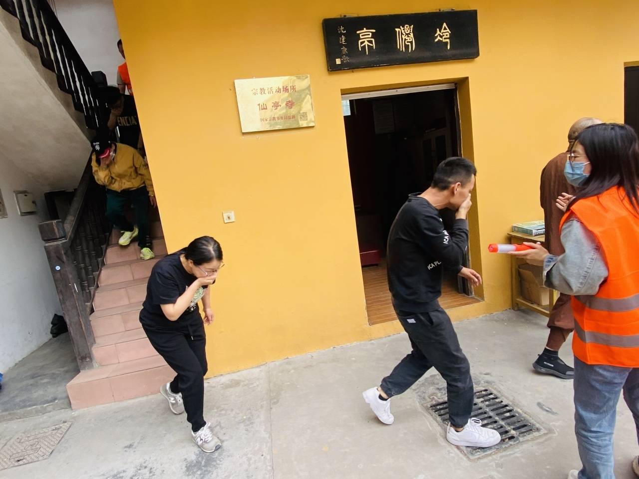 随着警报声的响起,疏散人员迅速到达执勤点位,立即发出紧急信号:“地震来了,请大家不要慌张,要捂住口鼻,保护好头部,弯腰低头,防止被坠物砸伤,迅速撤离到安全点”。 在社区工作人员的引导下,寺庙僧人、居民迅速整齐地撤离到了指定的安全位置,并且清点撤离人数。整个演练过程组织有序,撤离迅速,紧张而不慌乱,达到预期目标。