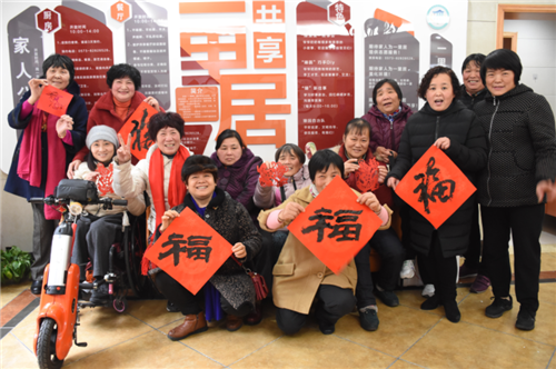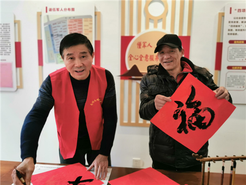 在退役军人服务站内,大家秩序井然地排着队等着拿大红的福字,感受着过年的喜庆气氛。沈师傅下笔遒劲有力,一气呵成,他写的“福”字赢得居民的一致好评。