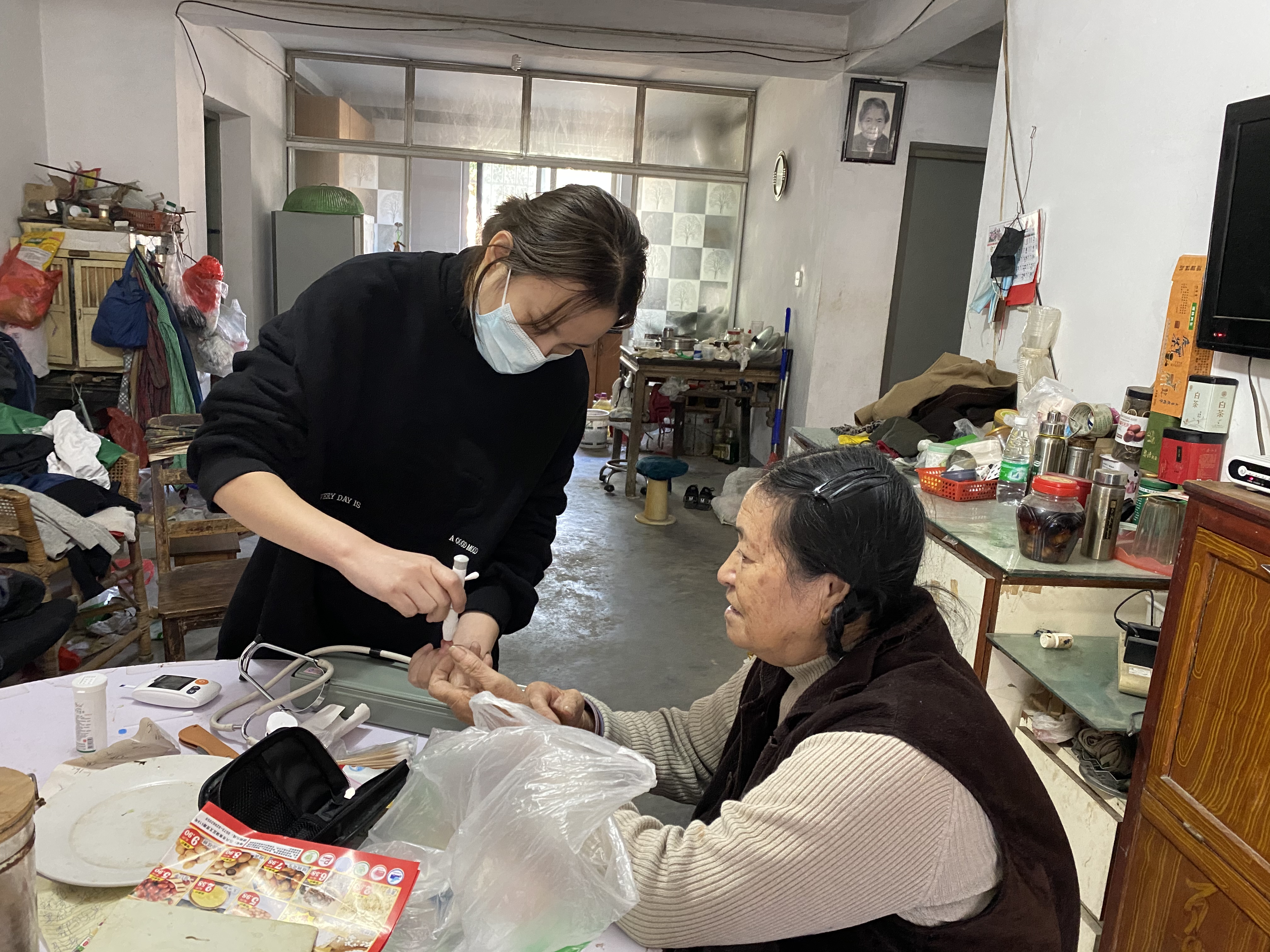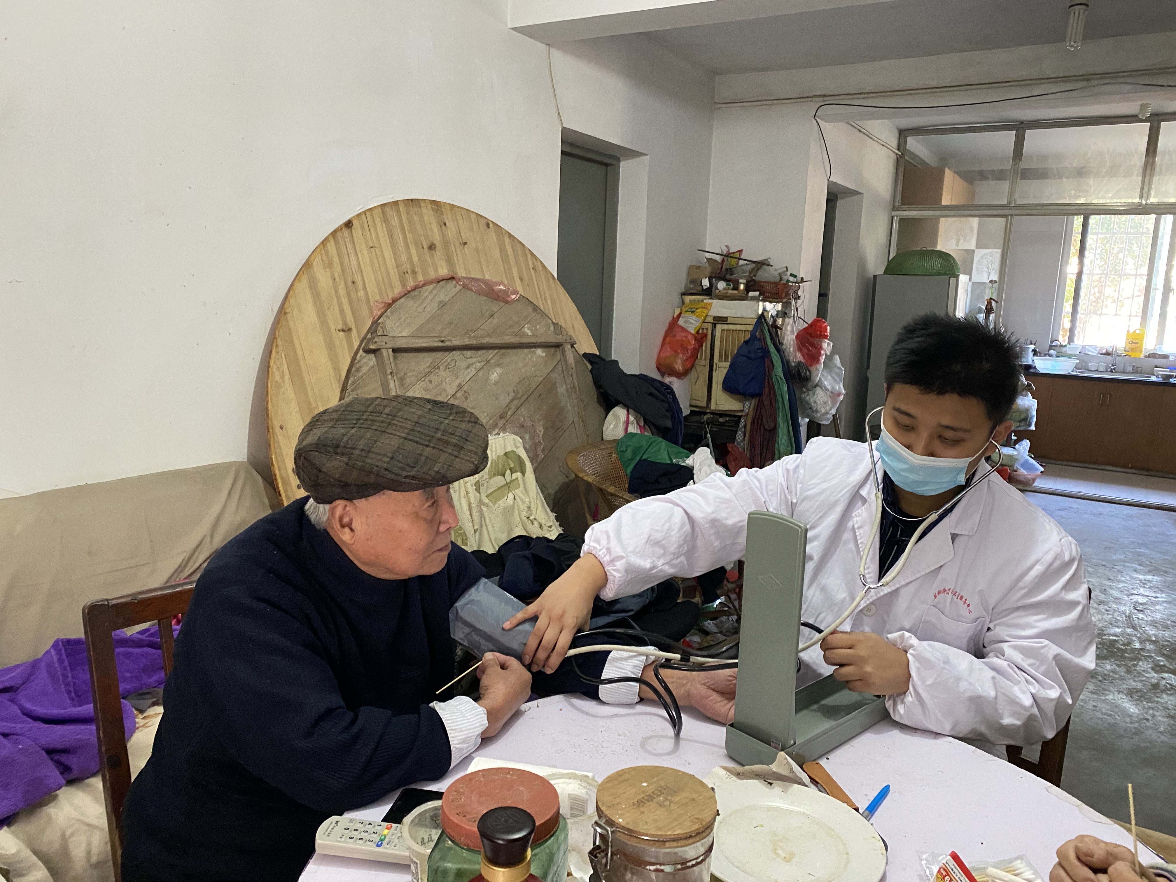 11月11日上午,南湖区东栅街道文贤社区工作人员联合东栅卫生院医生周歆信团队来到辖区高龄老人沈师傅和寿师傅家里,上门为老人量血压、测血糖。
