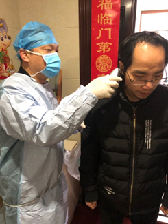每日对于排摸中出现的隔离人员,社区工作者陪同卫生院医护人员上门进行体温测量。