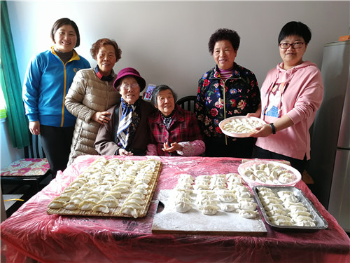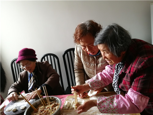 大家娴熟地在桌上包着饺子,摊开饺子皮,夹上适量的肉馅,然后再一点一点地将饺子皮封口并捏出好看的褶子,彼此之间有说有笑,热闹非凡。一会儿功夫,盘子里就放满了个头十足、形状好看的饺子。在寒冷的冬季,这样的饺子吃起来香在嘴里,却更是暖在心里。姚阿姨握着社区党委副书记屠玲华的手,感激地说:“我年龄大了,腿脚不方便,一个人在家特别冷清,社区时常想着我,我真的很感动,太感谢你们了!”