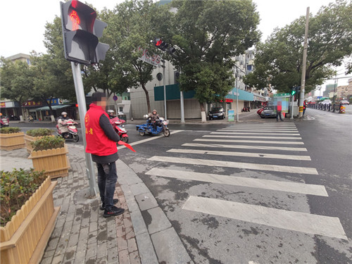 虽然天公不作美,但是社区矫正对象的热情一点都不减。在新丰镇的主要路口,两人一组,分设四个路口。一支身穿红马甲的特殊志愿服务队伍,在新丰司法所工作人员及近邻社工的带领下,扮演起了乡镇平安建设文明使者,对过往的行人及电瓶车主进行交通劝导。
