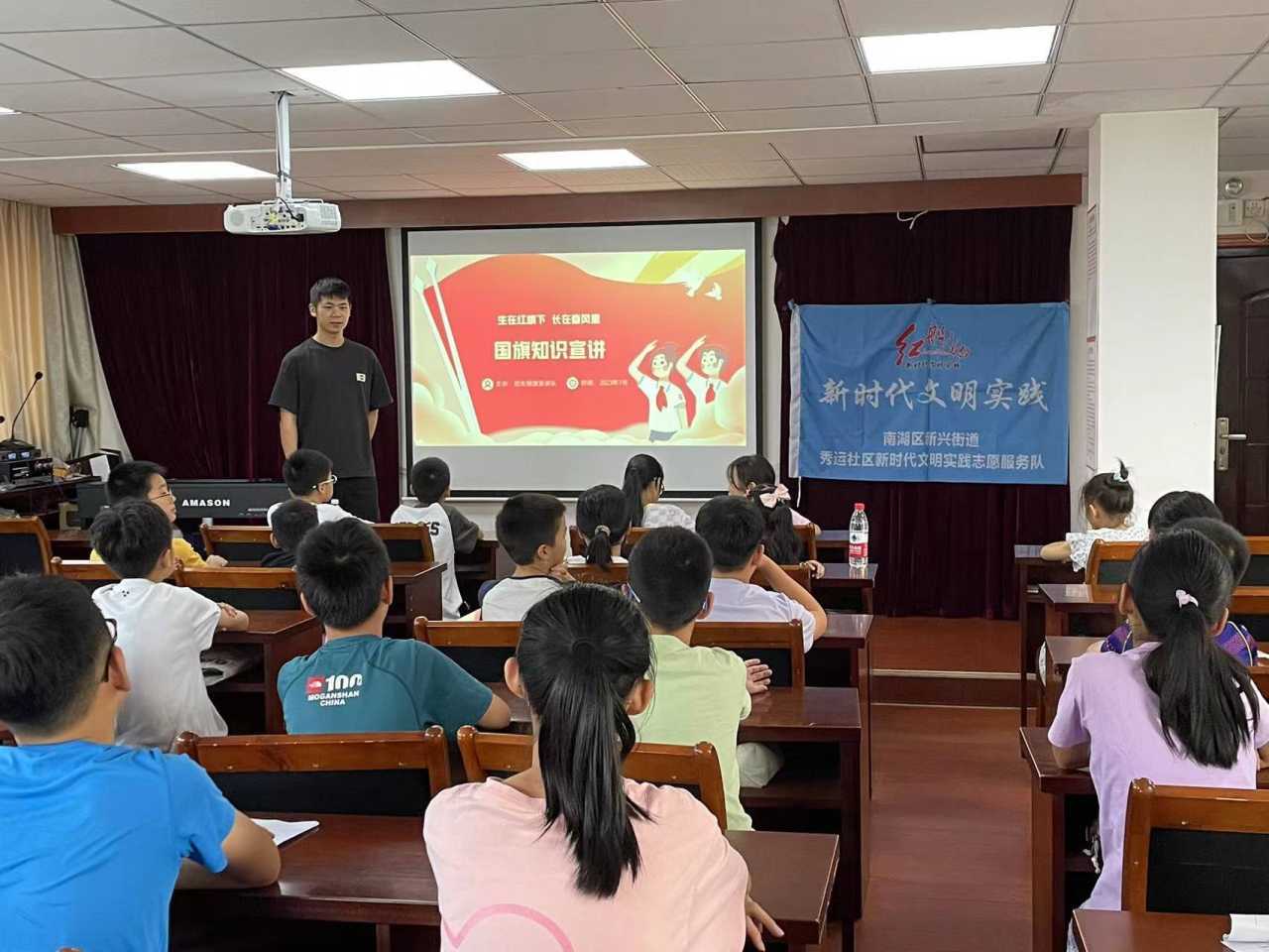 “小朋友们,你们知道国旗第一次升起是在什么时候吗?” 本次活动由提问的方式拉开序幕,志愿者刚提问完,孩子们就纷纷举手抢答,并且给出了正确答案,多轮提问过后,志愿者向小朋友们详细讲解了国旗的基本知识、历史和精神内涵、国旗的使用场合及规范等内容。讲解加竞答的形式更好地调动了孩子们学习的积极性。