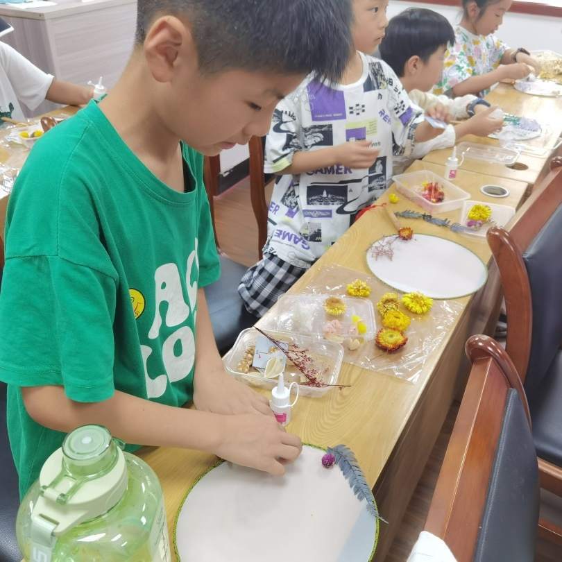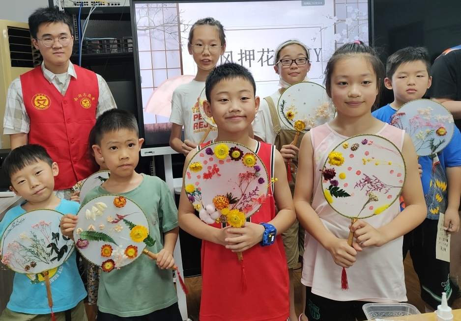 活动中,大学生志愿者们首先向小朋友们介绍了团扇的发展历史,并将提前准备好的干花、团扇等素材分发给大家,指导制作精美的干花团扇。