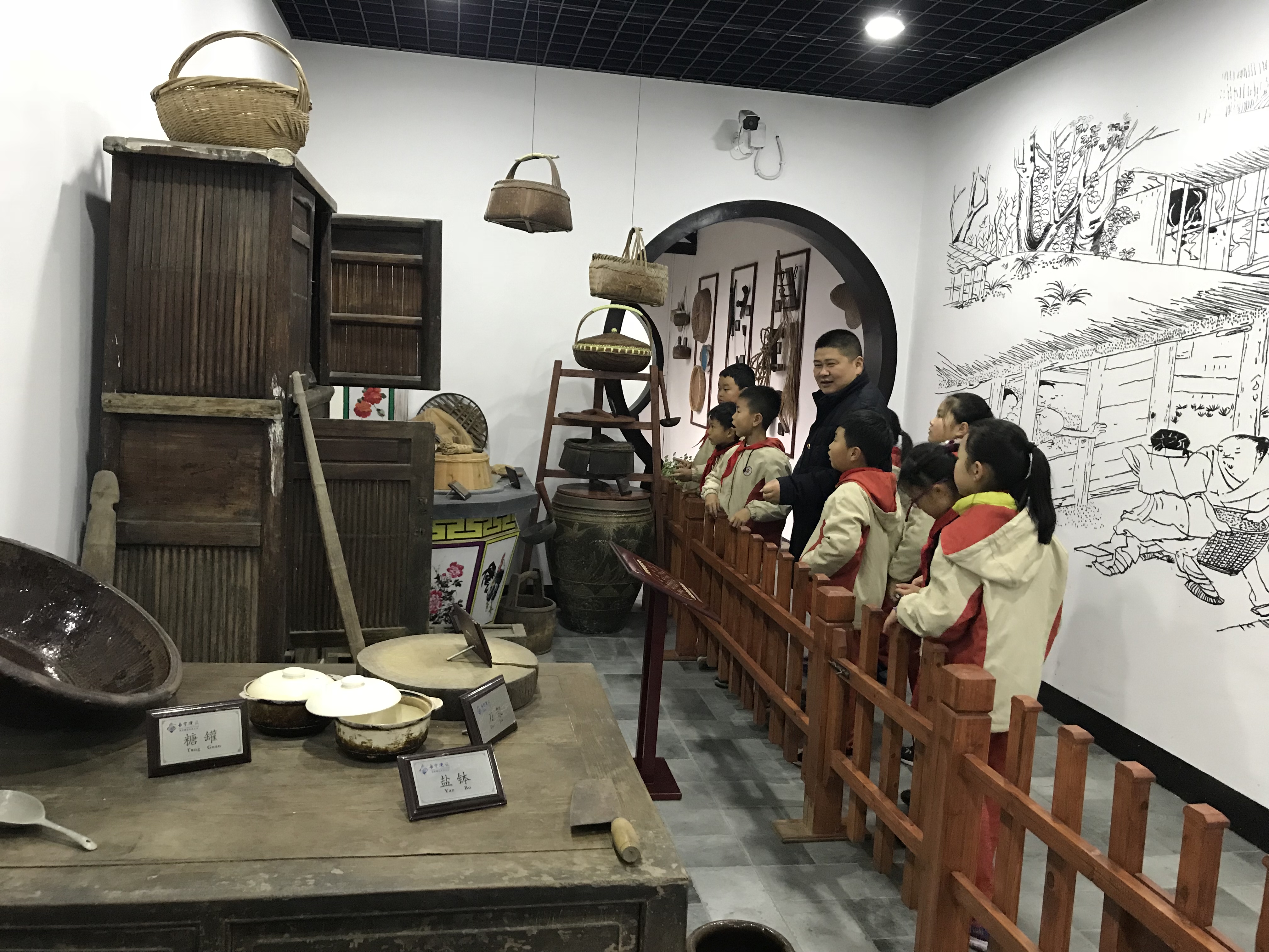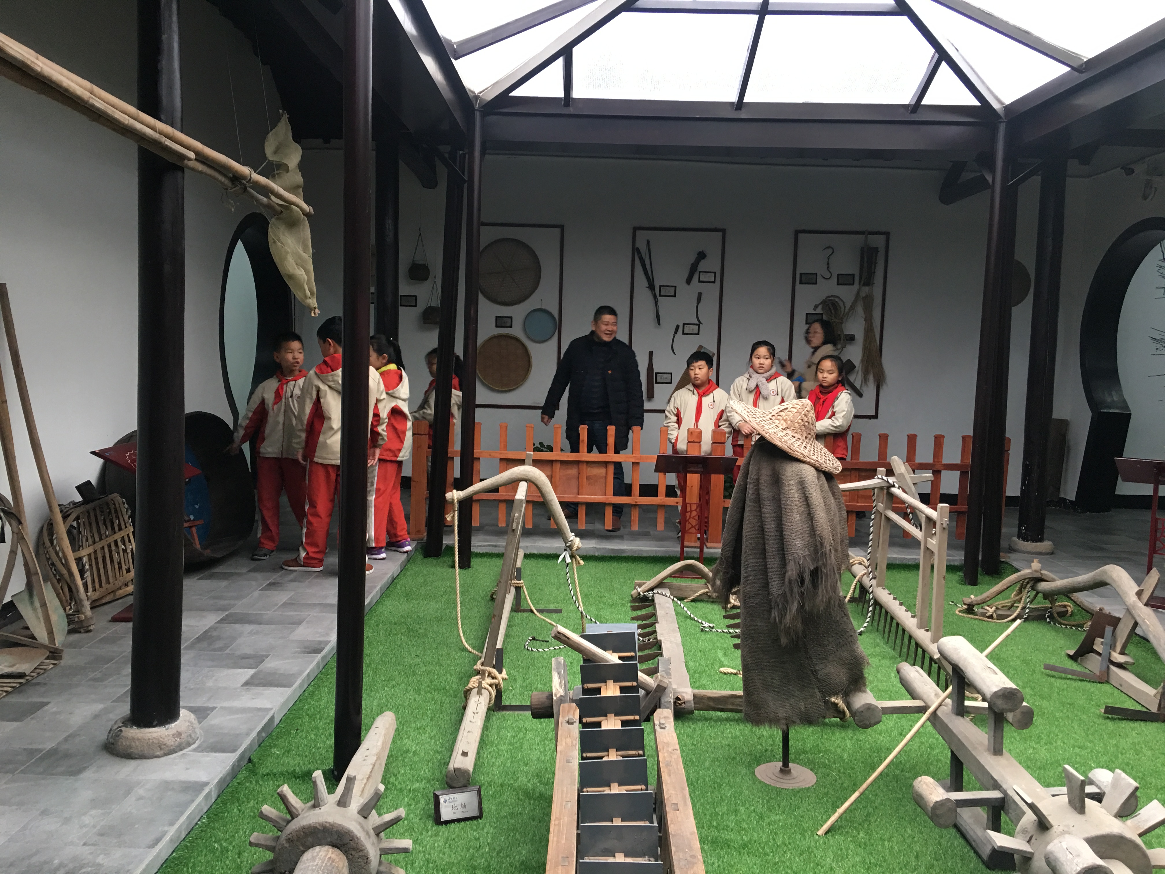 普光村的农耕记忆馆内收藏了200多件古农具、古家具,。一进门家长和孩子们就被各式各样的古物吸引了,他们从右边穿堂而入,参观了童趣区、耕作区、织布区、缝衣区等。小朋友们对各式各样的农具产生浓厚的兴趣,发出各式各样的疑问:“这个是水车吗?”“这个我奶奶家以前有,我见过”“这个是采菱用的吗?”家长们则细细品味着每一件物品,就好像在回味着自己的童年生活,让他们想起自己的乡愁。