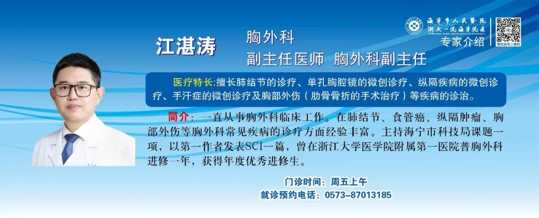鱼伟江:主治医师,每周三门诊。擅长胸外科常见病,如肺部结节、纵隔肿物、手汗症及胸部外伤(肋骨骨折、血气胸、自发性气胸)的救治。曾进修于浙江大学医学院附属第一医院。