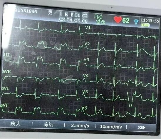在海宁市中医院急诊科,张大伯嘴唇发白、意识模糊,生命体征不稳定。医护人员紧急为其开通绿色通道,发现心电图波形“不对劲”,提示为急性下壁心肌梗死。