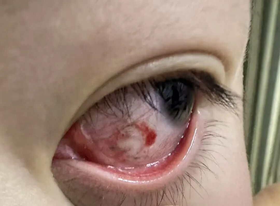原来,童童不慎被铅笔尖直直戳中左眼。检查发现,其左眼结膜撕裂,伤口内嵌有黑色铅笔芯。情况紧急,必须立即手术探查并取出异物,否则可能引发感染或影响视力。