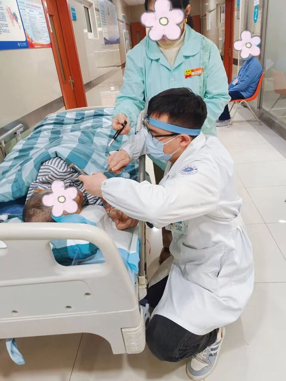 这位高龄患者年老体弱,身体机能衰退,难以配合常规诊疗操作。为了更清晰地观察病情、更精准地完成检查,医生主动放低身姿,不顾地面冰凉,以跪地姿势贴近病床开展诊疗。面对患者的不配合,他没有丝毫急躁,而是耐心调整角度、反复尝试,长时间保持跪姿,用专业与细心一步步推进治疗,眼神里满是对生命的敬畏与温柔。