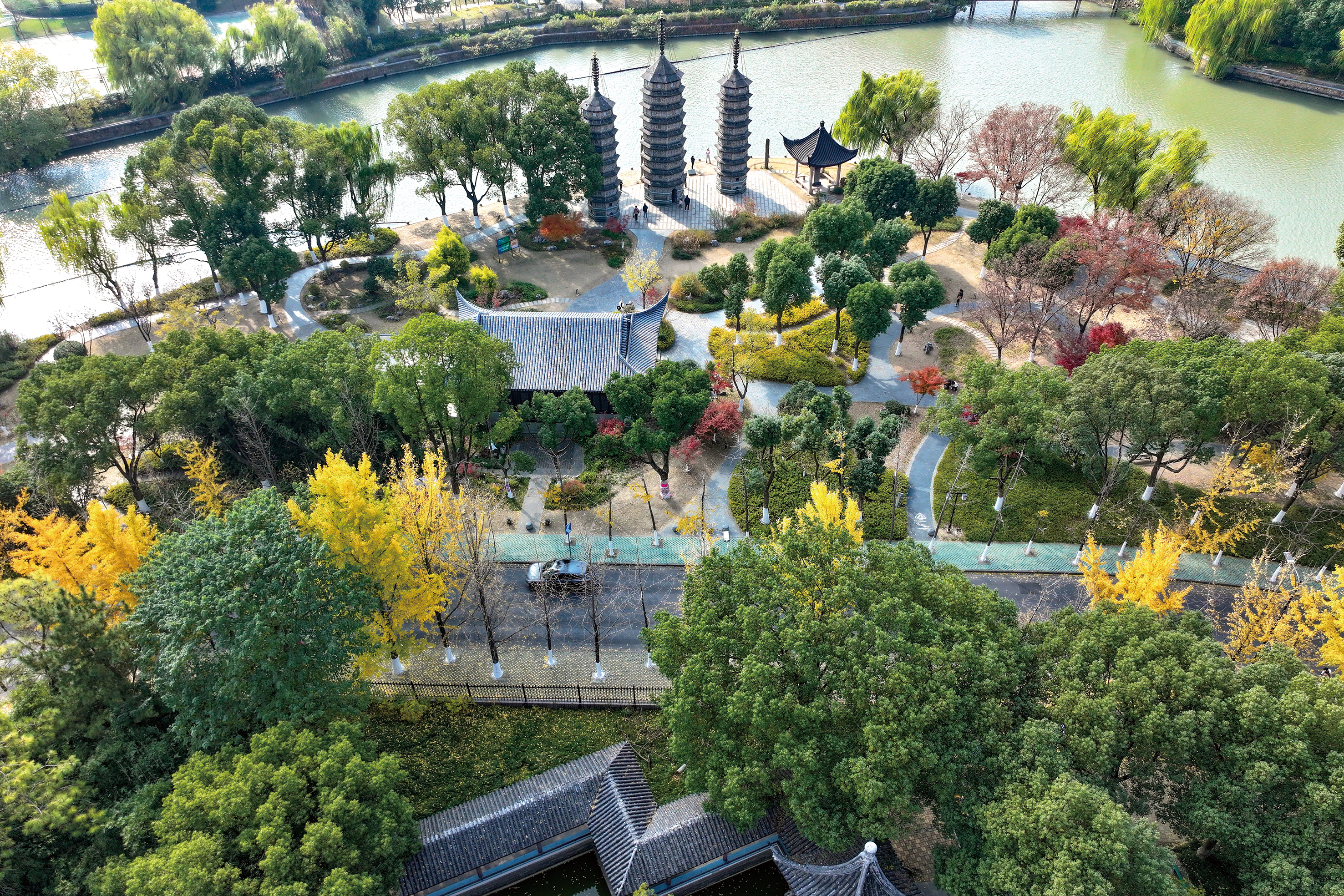 南湖区三塔路上的银杏树群和三塔相望。每年秋冬季节,嘉兴人热衷于到三塔路打卡。