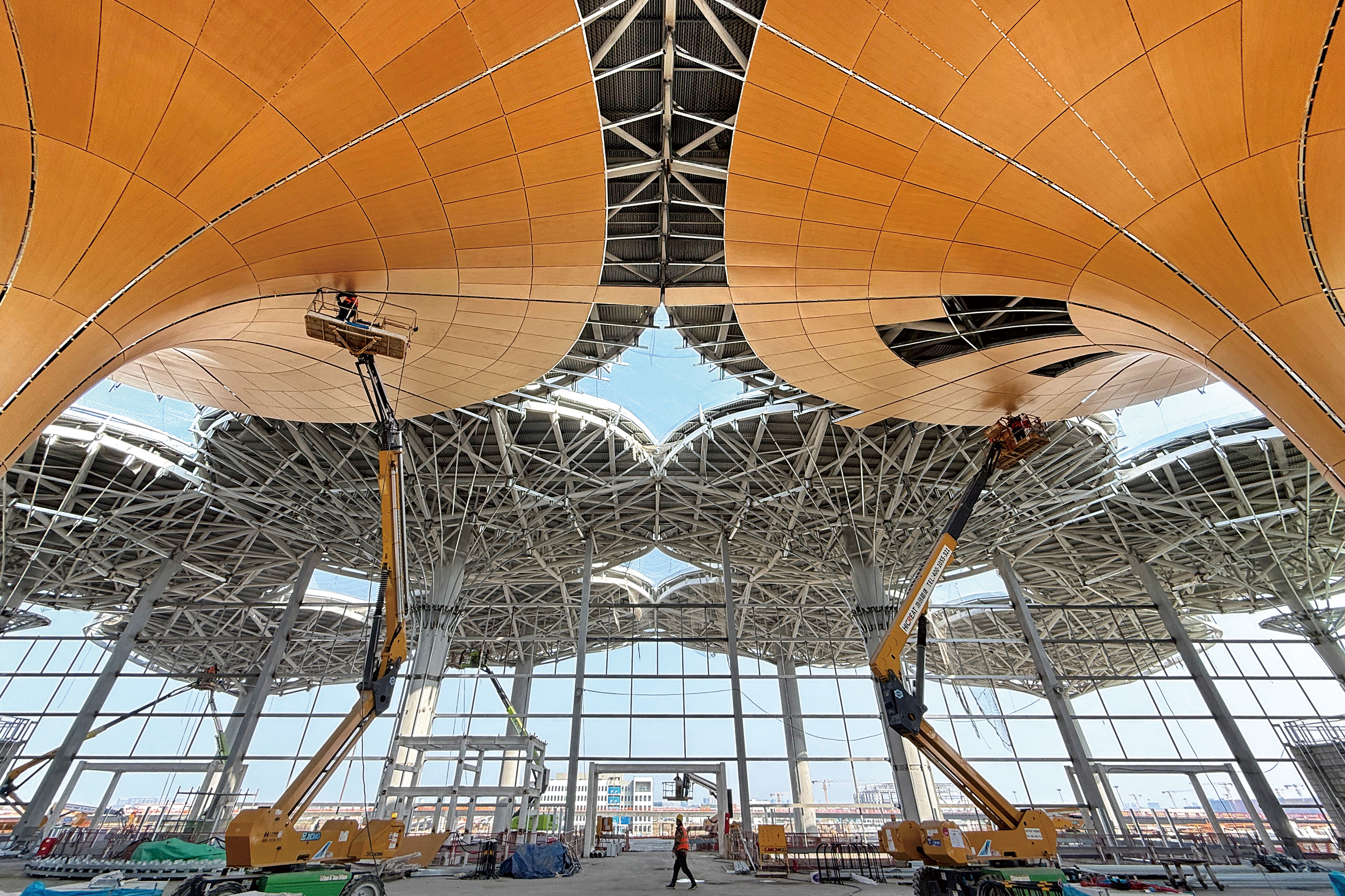 2025年2月5日,春节长假后第一个工作日,在嘉兴南湖机场航站楼楼顶,百余名建设者在航站楼“花瓣”区域进行作业。