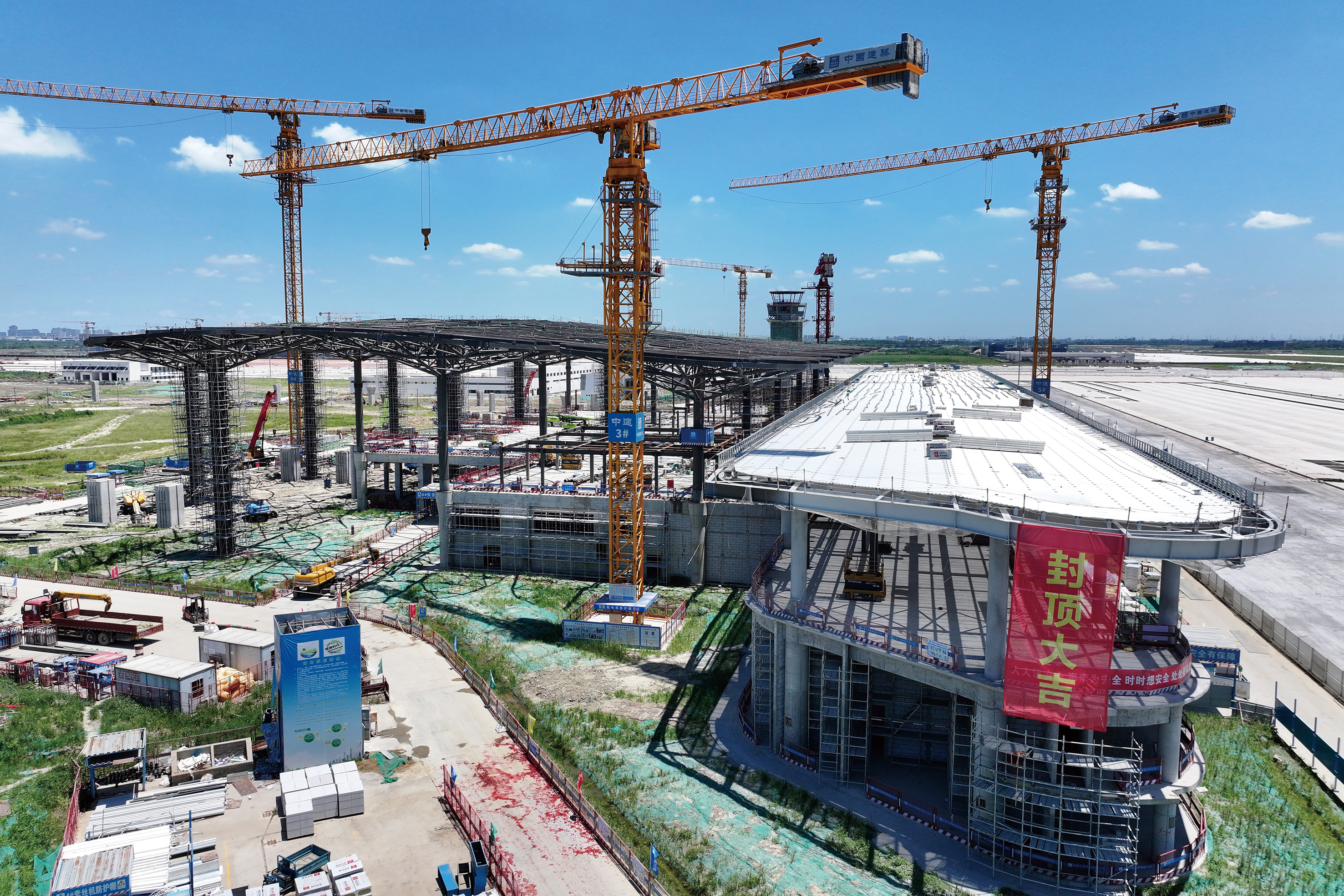 2024年7月29日上午,随着最后一根钢结构件的起吊,标志着嘉兴南湖机场航站楼主体钢结构正式完成封顶。