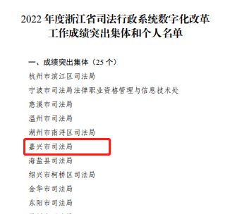 近日,浙江省司法厅对2022年度全省司法行政系统数字化改革工作先进予以表彰,嘉兴市司法局喜获成绩突出集体荣誉。